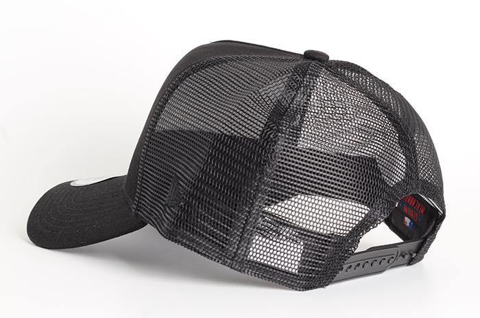 Rounded crown with black structured front panels and mesh rear panels