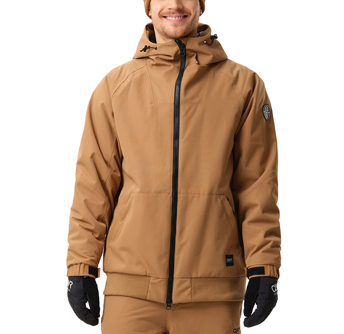 Features: Taped seams, articulated sleeves, fleece-lined collar and pockets, snow skirt, underarm vents, adjustable cuffs, cuffed bottom hem