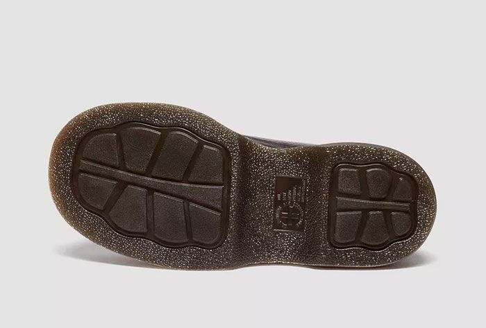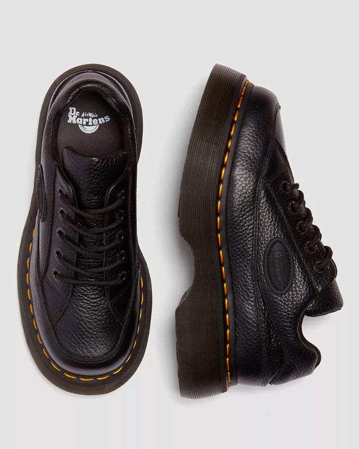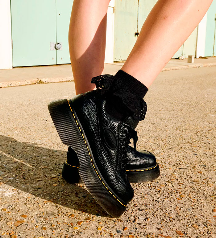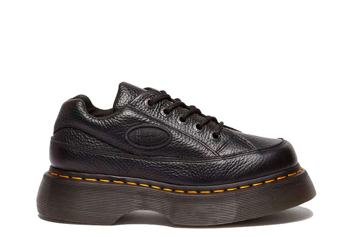 Feel the Buzz. Inspired by our 90s silhouettes, the new Buzz 5-eye shoe grabs attention from top to bottom. It stands on our chunky barrel-edge Buzz sole — marked with DM’s grooving, yellow welt stitching, and a leaf pattern on the undersole. The soft Milled Nappa leather upper has a comfortable padded collar and an inflated, rubberised badge that echoes the contours of the sole.