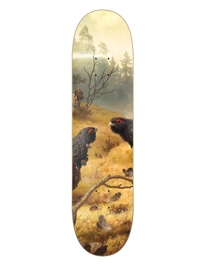 Skate deck featuring a print based on the painting "The fighting capercaillies" (1886) by Ferdinand von Wright.