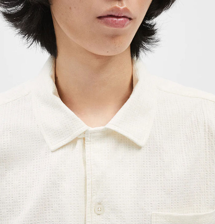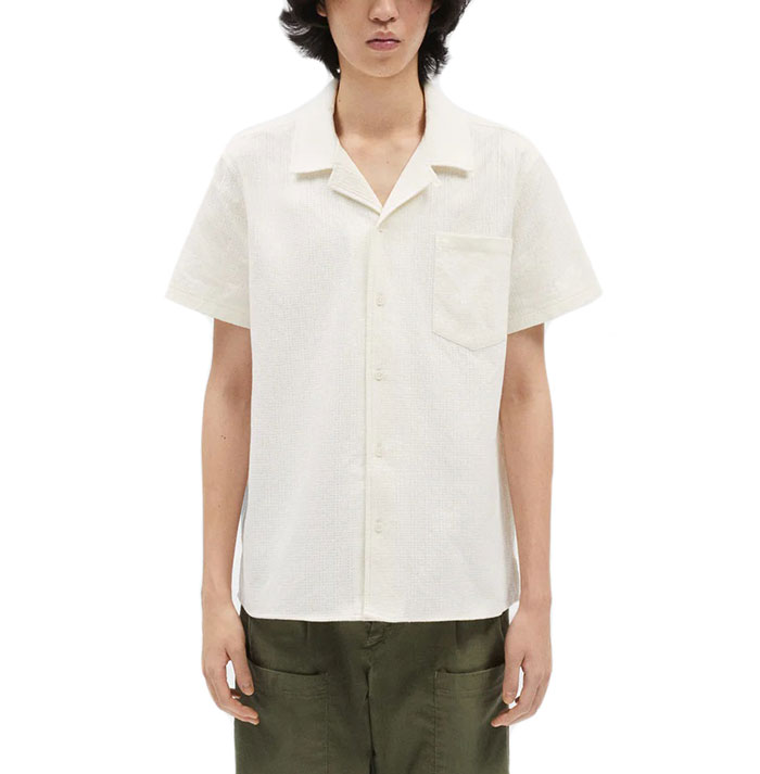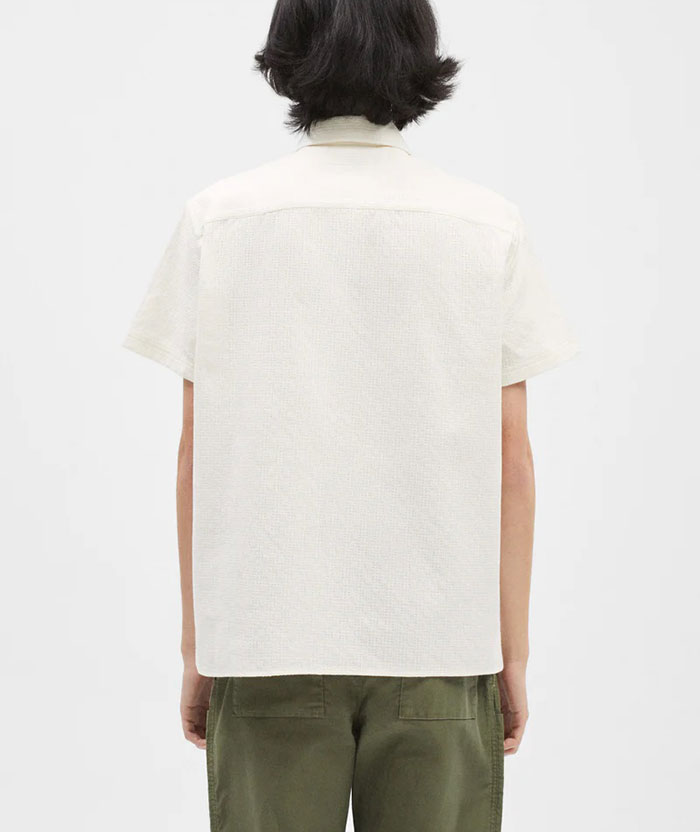 Short sleeve shirt in 100% cotton with micro-texture, resort collar, straight hem and side slits.