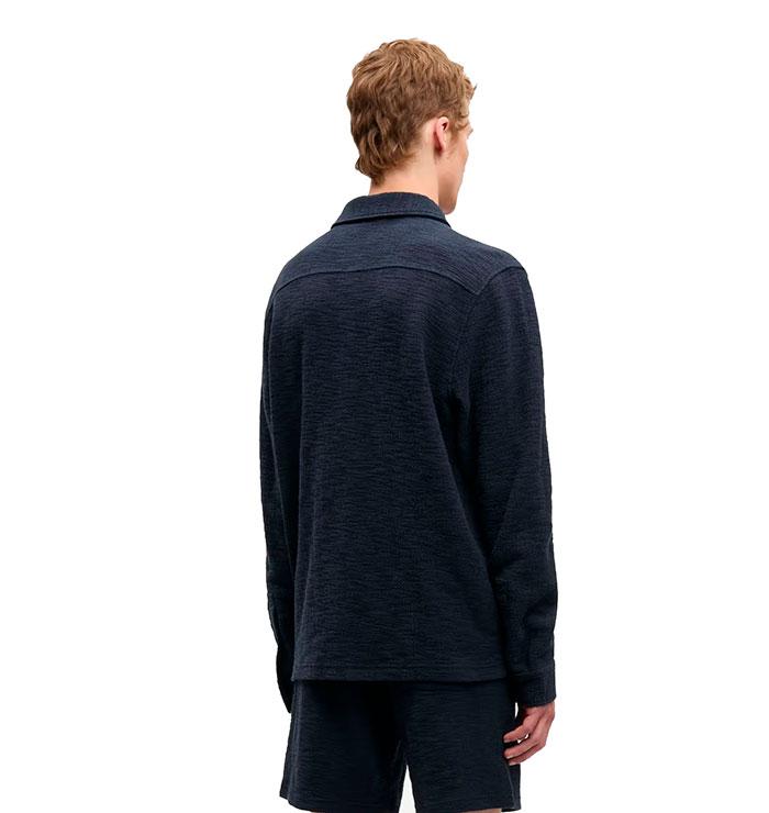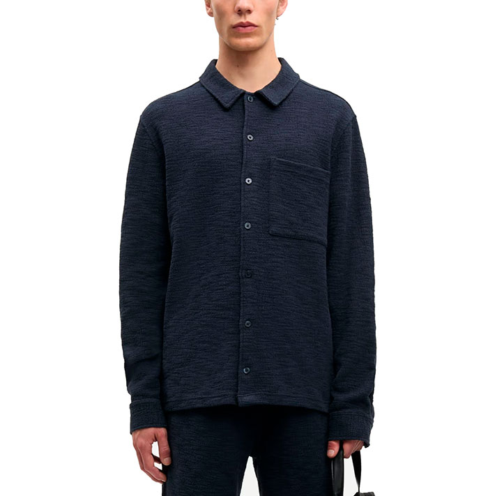 Long-sleeved jersey shirt. Button closure on the front and buttoned cuffs. Patch pocket at the chest. Neck yoke seam. Main material made from a blend of organic cotton and recycled polyester.